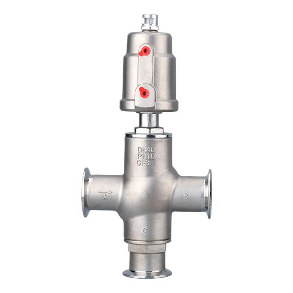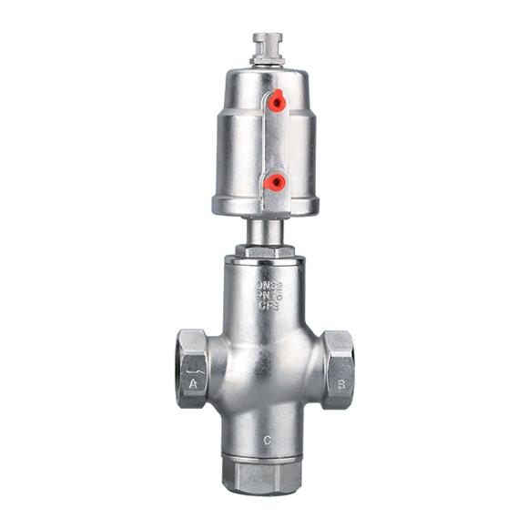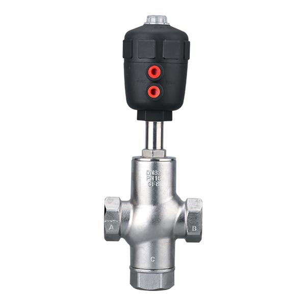 氣動(dòng)三通角座閥由氣動(dòng)執(zhí)行器和三通結(jié)構(gòu)閥體組成,共有三處通孔,主要作用是實(shí)現(xiàn)介質(zhì)的換向、分流、或混合功能。連接方式有螺紋、卡箍、法蘭等可根據(jù)現(xiàn)場(chǎng)需求選擇。